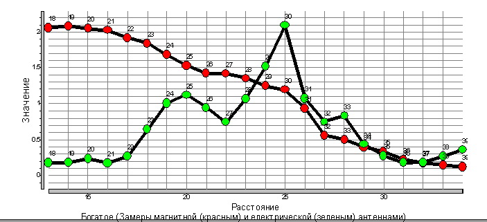 На графічному індикаторі трасошукача ОДНОЧАСНО реєструються результати обстежень, отримані від магнітних і електричної антен.